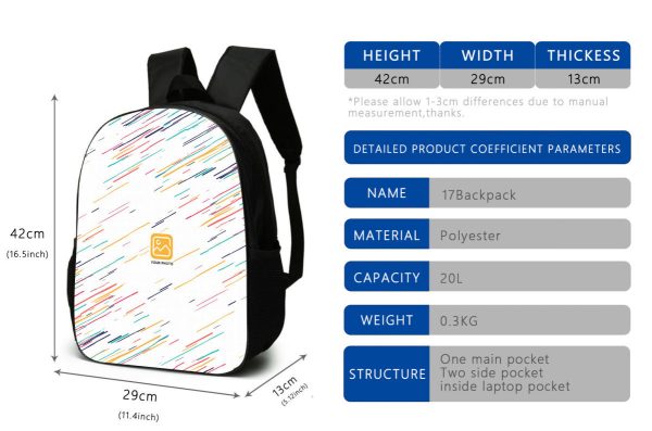 Backpack Measures 16.5” x 11.4” x 5.12”.